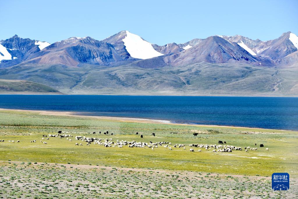 打加錯湖畔的羊群、牛群(8月30日攝)。新華社記者 劉文博 攝