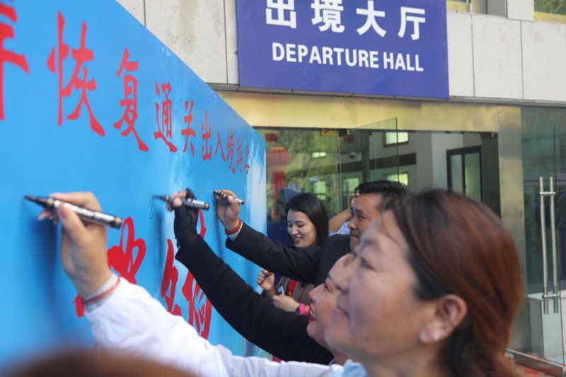 “心情很激動(dòng),現(xiàn)在可以從樟木口岸通關(guān)了,往來(lái)方便多了!”樟木鎮(zhèn)群眾索朗曲珍激動(dòng)地說(shuō)。同時(shí),她在國(guó)門(mén)簽名墻上寫(xiě)下了“祝祖國(guó)繁榮昌盛”的祝福。