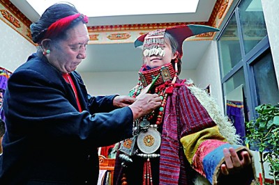眾多的藝術形式當然也會催生出絢爛多彩、雍容華貴的普蘭服飾,其中最有名的當數(shù)普蘭“宣”服(又稱飛天服),單是穿戴這套服飾就要用一個多小時。地處貿(mào)易要道的普蘭人,將遙遠的珊瑚、黃金、蜜蠟、白銀、綠松石、珍珠全都裝飾在“宣”服上,展示著對這襲錦袍的無比珍視。家族世代傳承“宣”服制作技藝的才旺多吉現(xiàn)在不僅把技藝公開傳授,每年單靠制作“宣”服,純收入就能達到四五萬元,而且通過普蘭的邊貿(mào)市場,這些服飾還能賣到尼泊爾和印度。