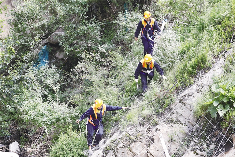 “剛下過雨,地面濕滑,大家一定要抓牢踩實,防止滑倒。”走在最前面的工長東生瑞轉(zhuǎn)身大聲提示大家,他的聲音隨風(fēng)在山谷間回蕩。在一段陡峭的山路旁,來自東北的“00后”小伙杜猛發(fā)現(xiàn)一塊大石頭下面有空虛的跡象,他立即向東生瑞匯報,并拿出自噴漆,在石頭周圍噴上記號和巡視日期。