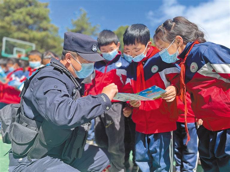 林芝邊境管理支隊(duì)南伊邊境派出所副所長(zhǎng)趙軍為小學(xué)生開展安全宣傳,講解民族團(tuán)結(jié)相關(guān)政策。記者 張猛 攝