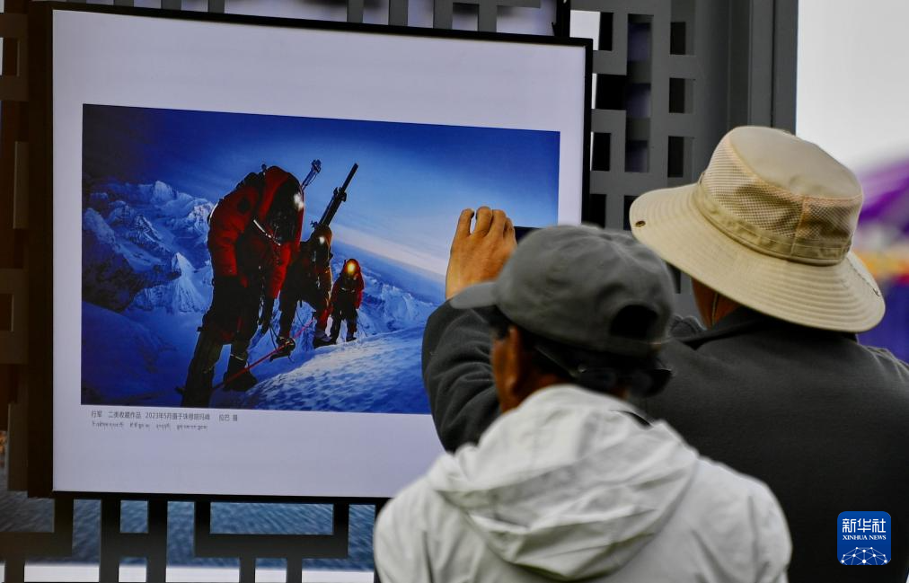 在拉薩市林周縣邊交林鄉(xiāng)當杰村,觀眾在欣賞第十六屆西藏珠穆朗瑪攝影大展作品(9月8日攝)。新華社記者 張汝鋒 攝