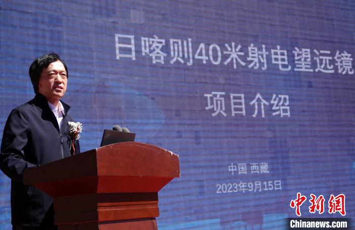 9月15日,中國科學院上海天文臺臺長沈志強在日喀則40米射電望遠鏡項目啟動會上,介紹該項目相關情況。中新網記者 孫自法 攝