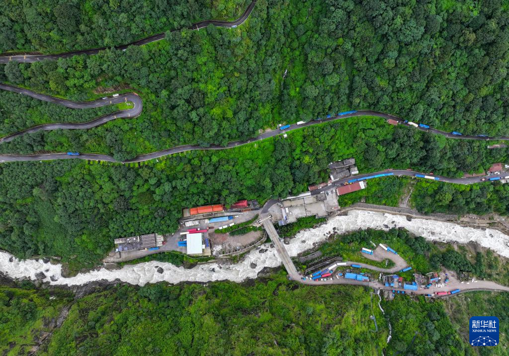 俯瞰樟木口岸的中尼友誼橋和通向樟木鎮(zhèn)的盤山公路(無人機(jī)照片,9月9日攝)。新華社記者 姜帆 攝