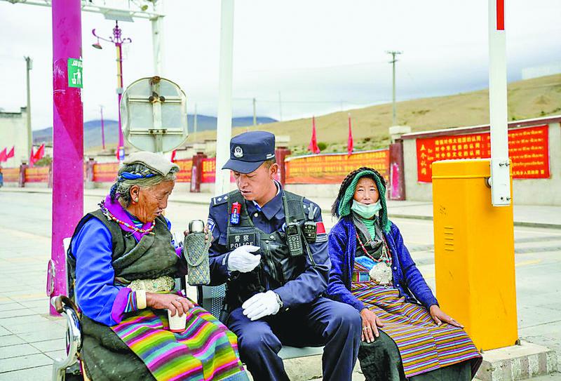圖為曲崗邊境檢查站民警在巡邏途中與路邊休息的老人交談。記者 趙文慧 通訊員 巴桑頓珠 白瑪倉(cāng)覺 攝