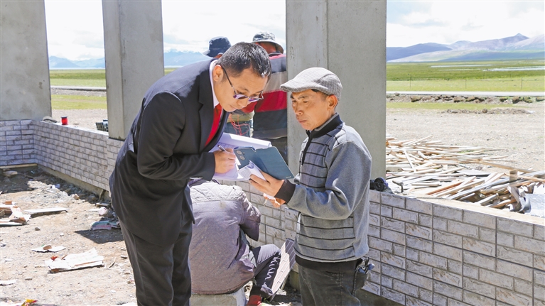 普瑪江塘中心法庭負責人巴桑次仁(左)正在向務工人員了解相關情況。