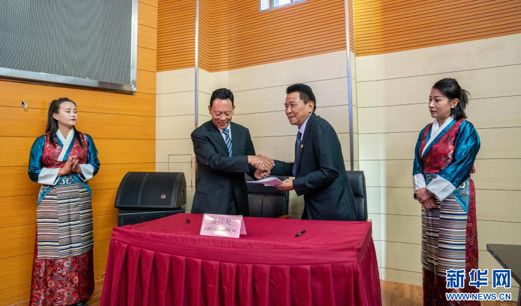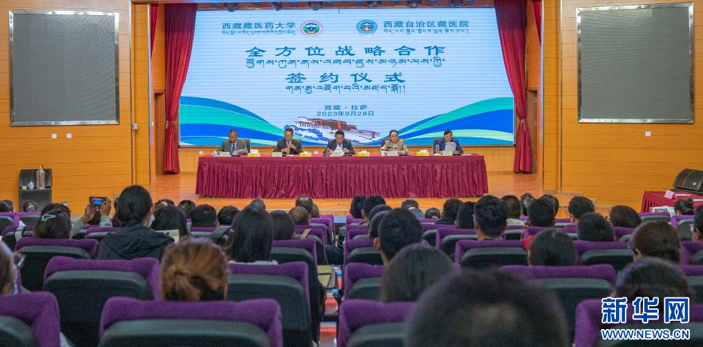 西藏藏醫(yī)藥大學(xué)與西藏自治區(qū)藏醫(yī)院全方位戰(zhàn)略合作簽約儀式現(xiàn)場(9月28日攝)。新華社發(fā)(丁增尼達攝)