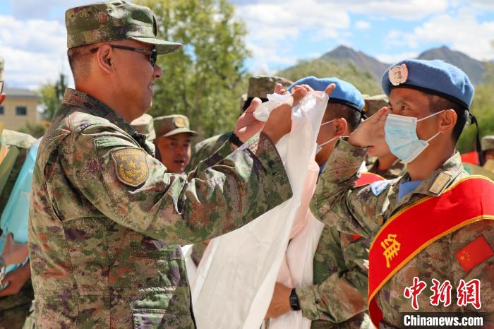 用哈達和鮮花迎接維和部隊官兵。彭毅攝