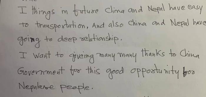 國之交在于民相親,民相親在于心相通。采訪過后,這位老人認認真真地用英文寫下一封信并交給中新網記者。他說:“我相信,未來中尼交通將更加便利,兩國情誼將更加深厚。我非常、非常地感謝中國政府,為尼泊爾人民帶來了這些大好機會?!?/p>
