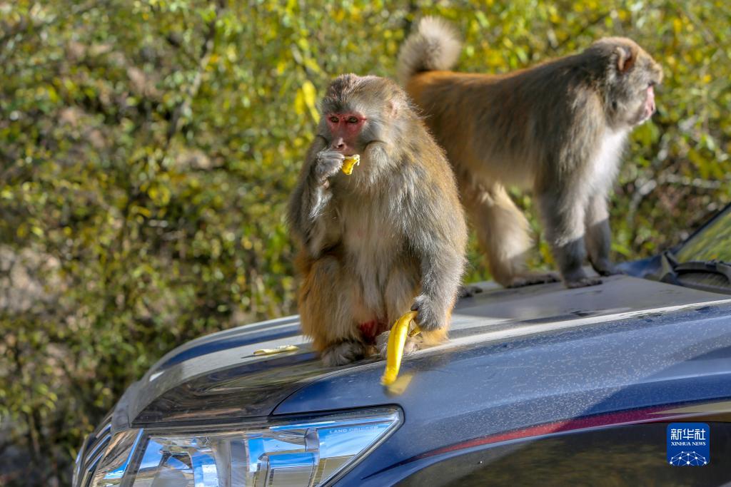 藏獼猴蹲在車頂上吃游客喂食的香蕉(10月25日攝)。新華社記者 邵澤東 攝