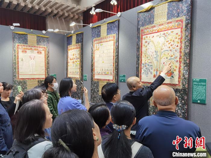 11月1日,“藏醫(yī)唐卡精品展”在中國(guó)藏學(xué)研究中心西藏文化博物館正式開幕。圖為講解員為嘉賓介紹藏醫(yī)唐卡展品。 記者 徐雪瑩 攝