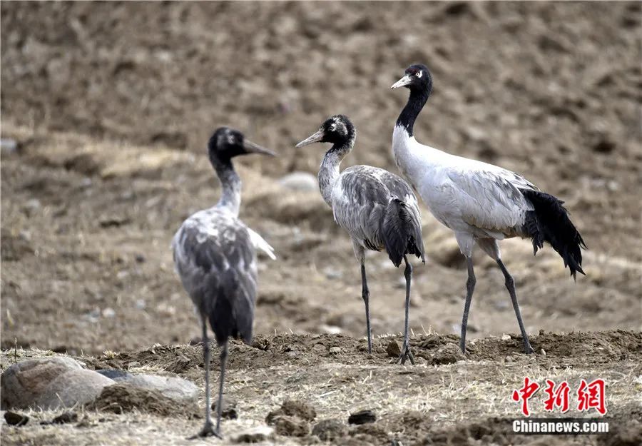 國家一級重點保護野生動物黑頸鶴在西藏拉薩楚布溝的農(nóng)田覓食。李林 攝