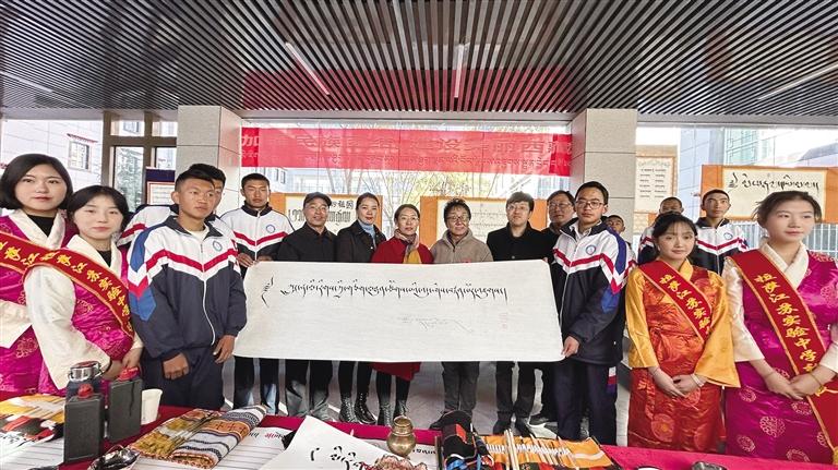 隨后,與會(huì)領(lǐng)導(dǎo)向江蘇實(shí)驗(yàn)中學(xué)贈(zèng)送了150套民族團(tuán)結(jié)進(jìn)步教育讀本。大家一同觀看了書畫社同學(xué)現(xiàn)場(chǎng)進(jìn)行的民族團(tuán)結(jié)進(jìn)步書畫作品創(chuàng)作。中國(guó)書協(xié)會(huì)員、自治區(qū)政協(xié)委員、拉薩市政協(xié)常委、區(qū)市書協(xié)副主席南杰旺扎現(xiàn)場(chǎng)創(chuàng)作了“鑄牢中華民族共同體意識(shí)”的藏文書法橫幅贈(zèng)送給江蘇實(shí)驗(yàn)中學(xué)。