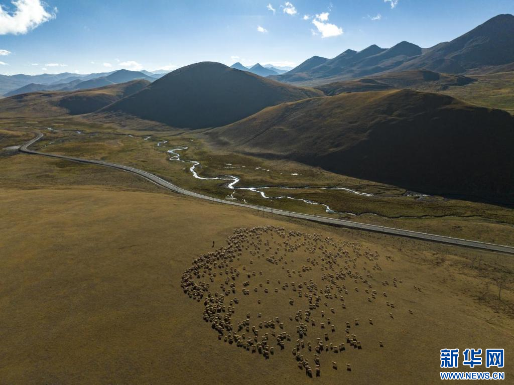 在西藏措美縣境內(nèi)拍攝的羊群(無人機照片)。新華網(wǎng) 旦增努布 攝