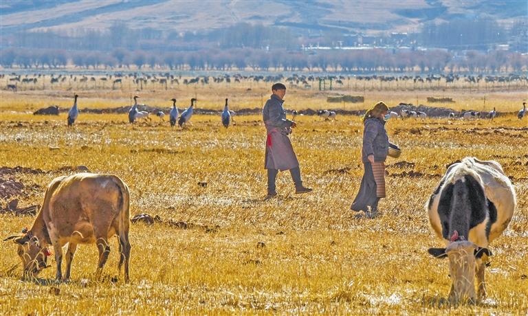 近年來,林周縣依據(jù)檢測情況和黑頸鶴棲息特點,建立了10個投食點,每年分4個階段在投食點投放青稞、冬小麥約1.7萬斤,通過采取不定時喂食,補充黑頸鶴食源。