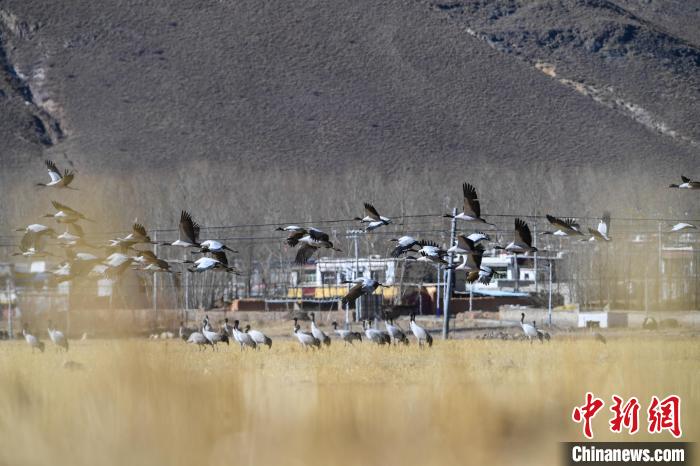 圖為拉薩市林周縣田間飛翔的黑頸鶴。貢嘎來(lái)松 攝