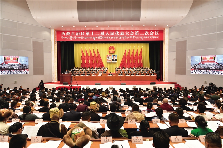 西藏自治區(qū)十二屆人大二次會議開幕現(xiàn)場?!∮浾摺〈稳势酱搿z