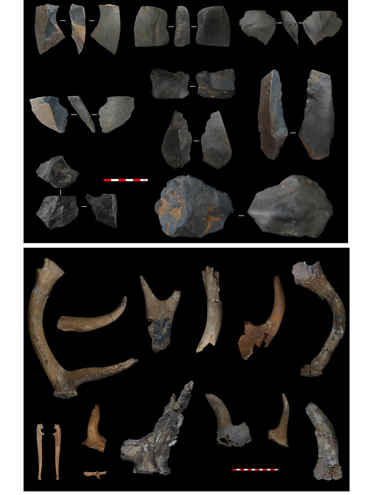 第一期遺存——石制品(上);第一期遺存——?jiǎng)游锘ㄏ拢?。(資料圖片由中國(guó)科學(xué)院古脊椎動(dòng)物與古人類研究所提供)