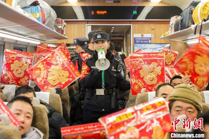 圖為春運首日,拉薩發(fā)往日喀則的C921次列車上,“格桑梅朵”乘警向旅客送“?!弊?。黃飛 攝