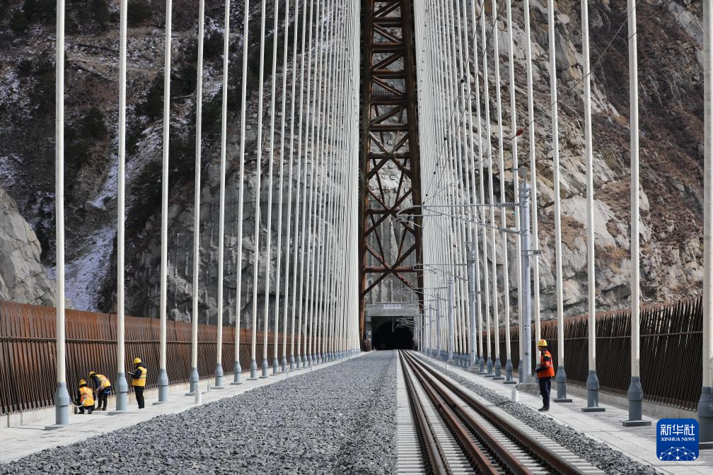加查橋隧工區(qū)維護人員在檢查藏木特大橋的擋風(fēng)板和吊桿(1月27日攝)。新華社記者 劉洲鵬 攝