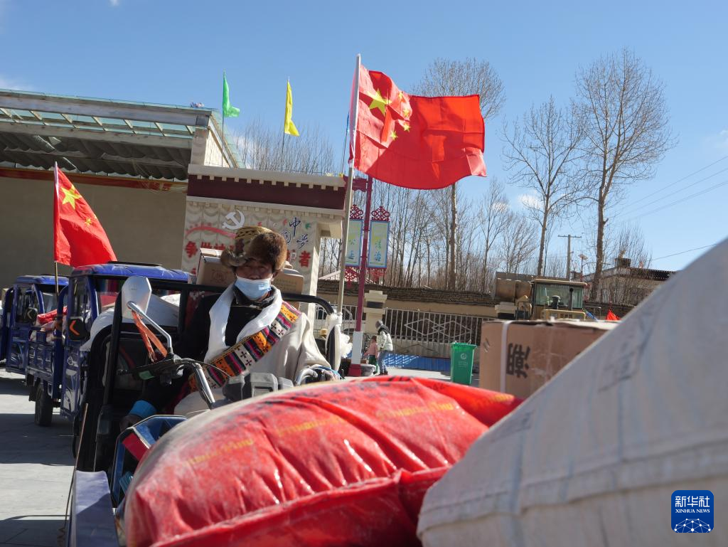 2月3日,努堆村2023年分紅大會(huì)現(xiàn)場(chǎng),村民用電動(dòng)三輪車將分紅物資運(yùn)回家中。新華社記者 洛卓嘉措 攝