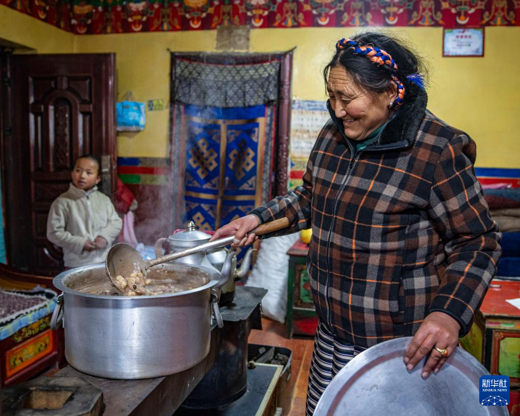在位于西藏拉薩市當雄縣公塘鄉(xiāng)甲根村的家中,斯曲旺姆的兒子索朗羅達為母親端上“古突”(2月8日攝)。新華社記者 孫非 攝