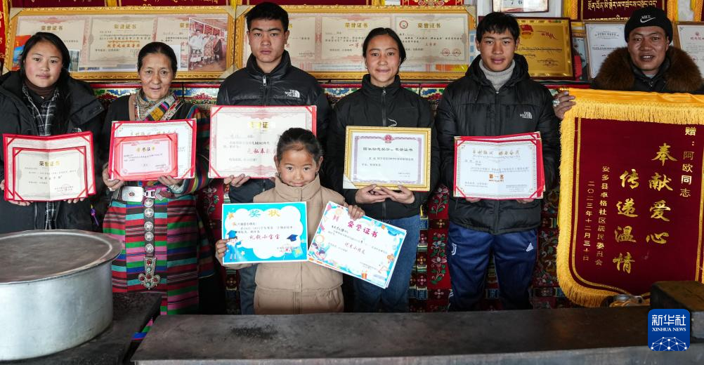 阿歐一家人展示家里人獲得的各種獎狀、證書(1月31日攝)。新華社記者 晉美多吉 攝