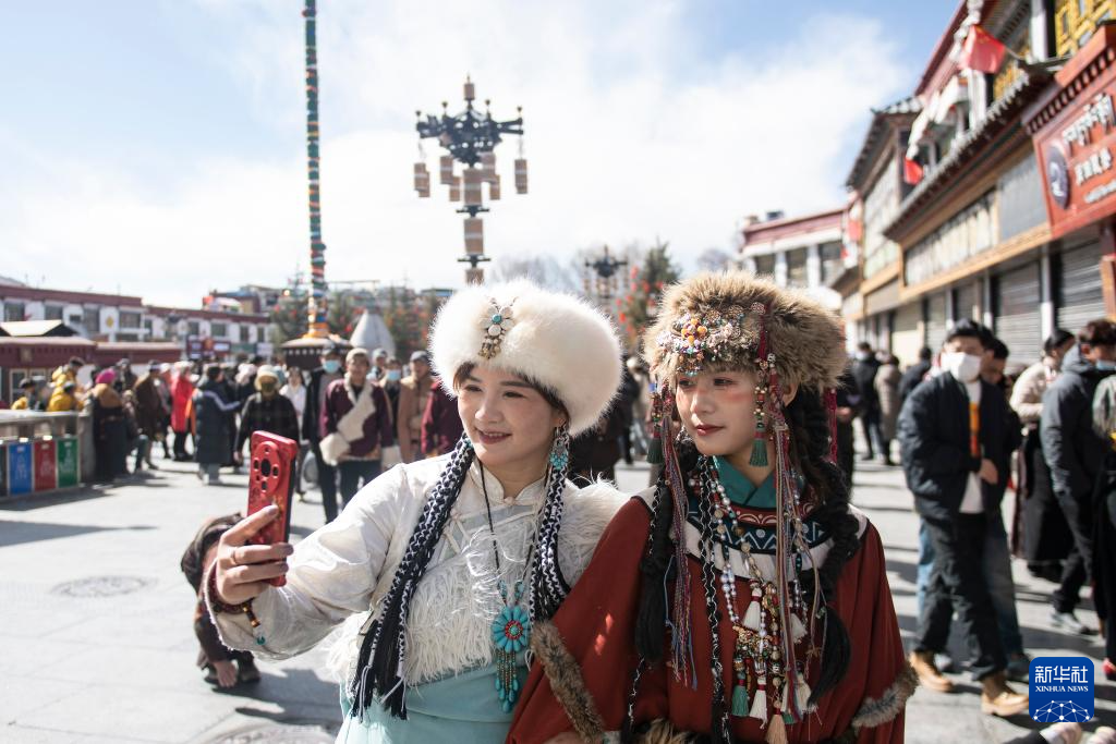 2月11日,游客在西藏拉薩八廓街拍照留念。新華社記者 孫瑞博 攝