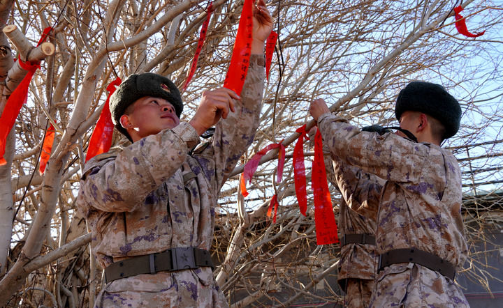 新春佳節(jié)來(lái)臨之際,阿里軍分區(qū)某邊防團(tuán)扎西崗邊防連戰(zhàn)士在“先遣柳”前懸掛心愿布帶,寄語(yǔ)新年祝福(2024年1月17日攝)。新華社記者 陳尚才 攝