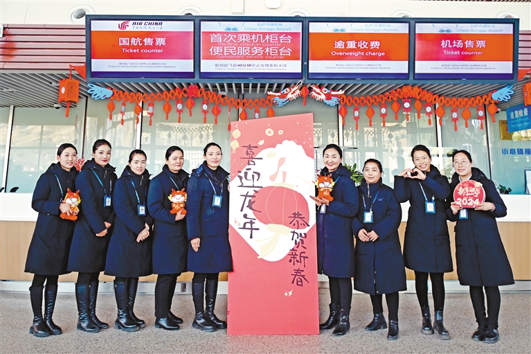 春運期間,西藏民航人為廣大旅客架起歸途的平安天路,保障安全、順暢、高效出行。圖為貢嘎機(jī)場旅服部工作人員在航站樓現(xiàn)場為旅客送上新年祝福。