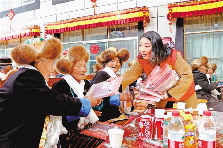 山南市瓊結(jié)縣各單位在縣集中供養(yǎng)中心聯(lián)合舉辦慶元宵活動(dòng),為供養(yǎng)中心老人分發(fā)保暖衣物。記者 洛桑 本報(bào)通訊員 次仁龍布 攝