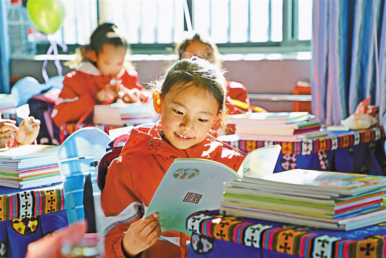 阿里地區(qū)陜西實(shí)驗(yàn)學(xué)校開學(xué)第一天,孩子們開心閱讀新課本。記者 洛桑旦增 達(dá)珍 永青 攝