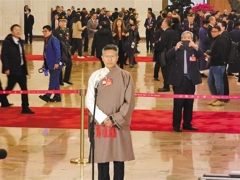 圖為3月7日上午,全國政協(xié)十四屆二次會議第二場“委員通道”集體采訪活動開啟。圖為住藏全國政協(xié)委員達(dá)瓦頓珠亮相“委員通道”并回答記者提問。