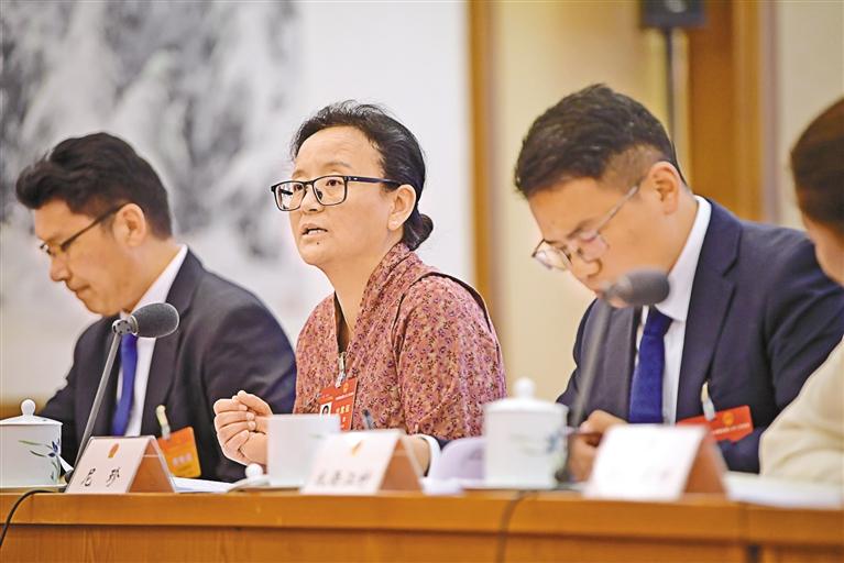 圖為3月7日,西藏代表團(tuán)舉行全體會議,傳達(dá)學(xué)習(xí)習(xí)近平總書記在看望參加全國政協(xié)十四屆二次會議的民革、科技界、環(huán)境資源界委員并參加聯(lián)組會議時的重要講話,審議國務(wù)院組織法修訂草案,繼續(xù)審查計劃報告和草案、預(yù)算報告和草案。圖為尼珍代表在會上進(jìn)行討論發(fā)言。 旦增西旦 攝