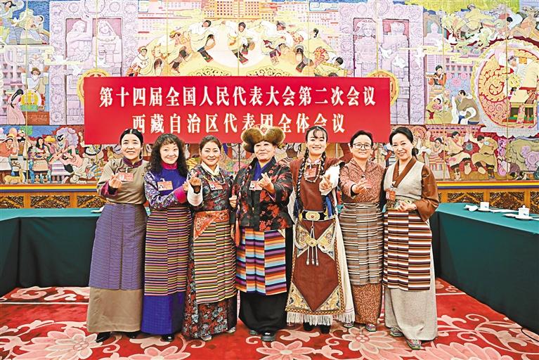 圖為西藏全國人大代表中的“七朵金花”在北京人民大會堂西藏廳合影留念,并祝福全區(qū)婦女同胞“三八”國際勞動婦女節(jié)快樂。