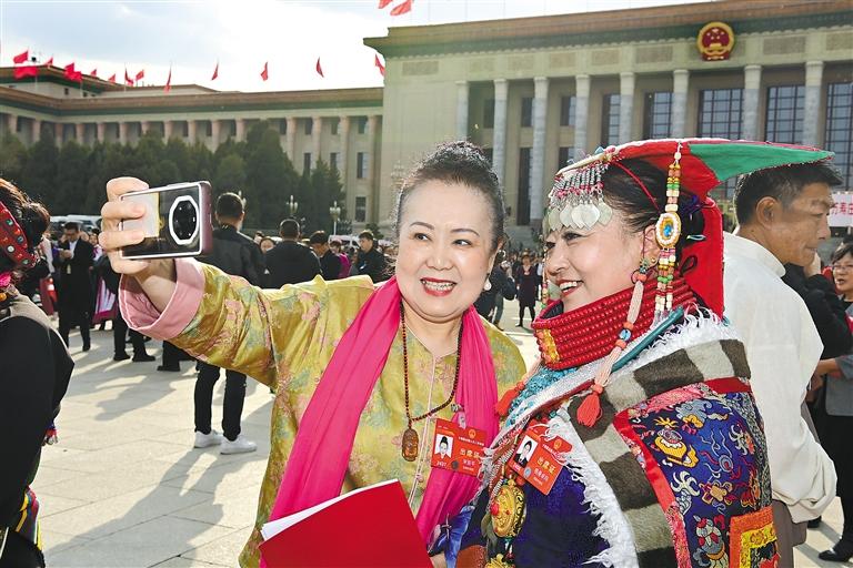 圖為西藏全國人大代表格桑卓瑪(右)與陜西省全國人大代表宋亞平(左)合影。