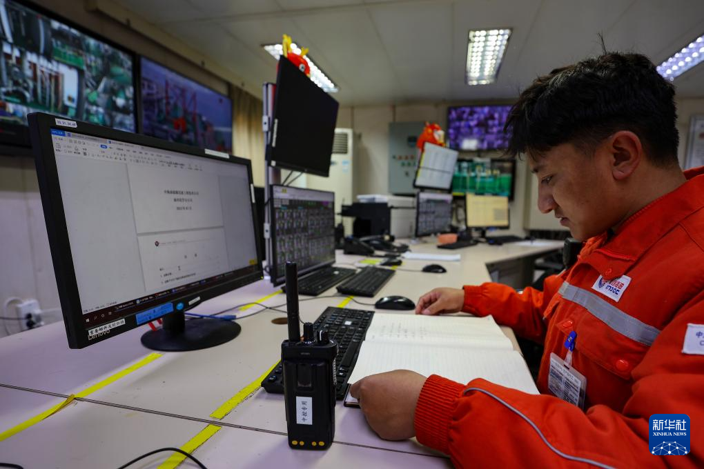 強巴在秦皇島32-6油田“渤海世紀號”(FPSO)16萬噸級浮式生產(chǎn)儲油裝置上的中央控制室進行參數(shù)核對和調(diào)整(3月7日攝)。新華社記者 姜帆 攝