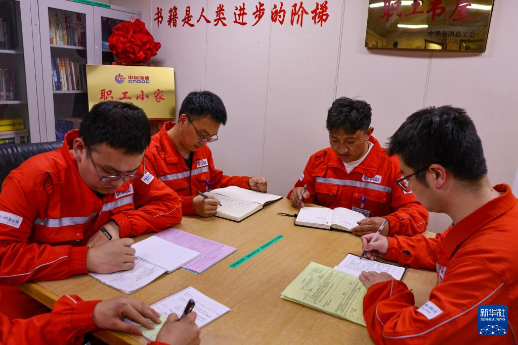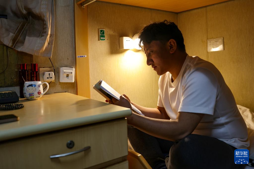 強巴在秦皇島32-6油田“渤海世紀號”(FPSO)16萬噸級浮式生產(chǎn)儲油裝置上休班的時候進行業(yè)務學習(3月7日攝)?,F(xiàn)在他正準備中級操作工資格的考試。新華社記者 姜帆 攝