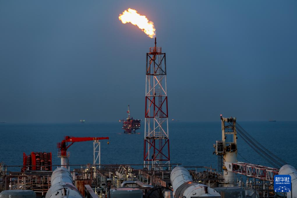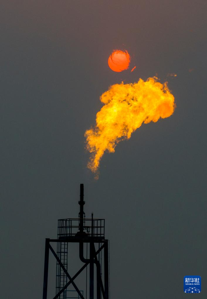 夕陽下的秦皇島32-6油田“渤海世紀號”(FPSO)16萬噸級浮式生產(chǎn)儲油裝置的火炬(無人機照片,3月7日攝)。新華社記者 姜帆 攝