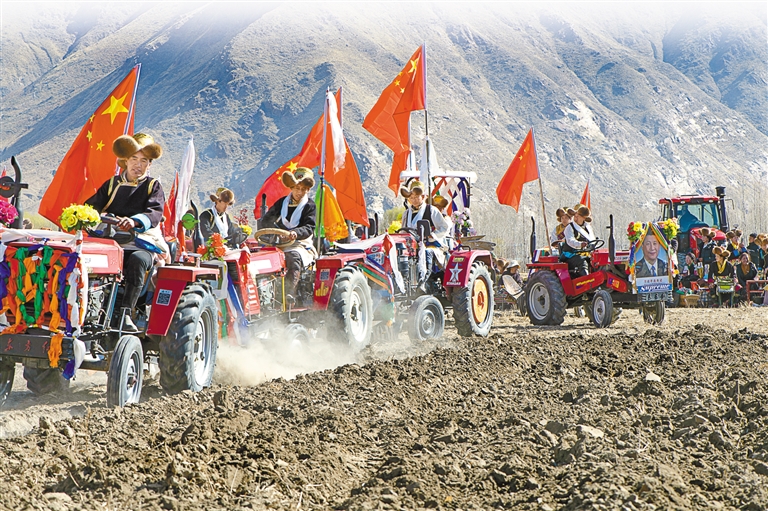 春耕春播儀式是西藏一年之中最隆重的農(nóng)事活動(dòng),這一天一定要用“二牛抬杠”犁耕法耕出新年第一犁。儀式上,村民們驅(qū)使著自家公牛緊跟拖拉機(jī),在承載著希望的田地上翻出一條條溝壟。隨后,姑娘們?nèi)鱿录挠杳篮米85姆N子,期盼全年風(fēng)調(diào)雨順、五谷豐登。