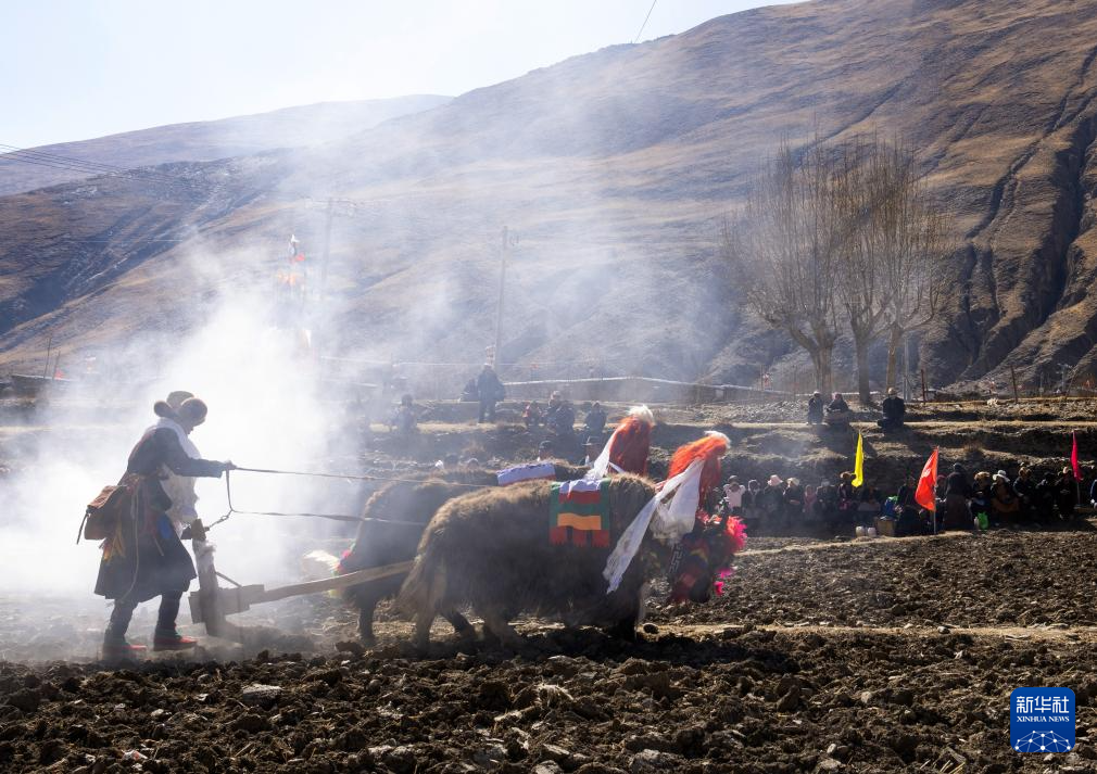 離村莊不遠(yuǎn)的一處農(nóng)田上,在百余名村民的注視下,12名壯年男子哼唱著古老的曲調(diào),驅(qū)趕耕牛耕出新年的第一犁?!稗r(nóng)業(yè)生產(chǎn)早就實(shí)現(xiàn)了機(jī)械化,之所以用傳統(tǒng)的‘二牛抬杠’來舉行開耕儀式,是為了更好地傳承高原農(nóng)耕文化?!奔勇榇逦瘑T會(huì)主任土旦說。