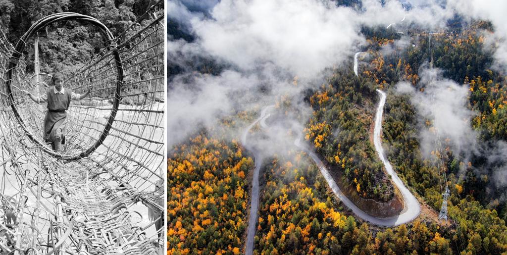 拼版照片:左圖是墨脫縣雅魯藏布江上的藤橋(20世紀80年代資料照片,新華社記者顧綬康 攝);右圖是2020年11月5日拍攝的派墨公路米林段公路。新華社發(fā)