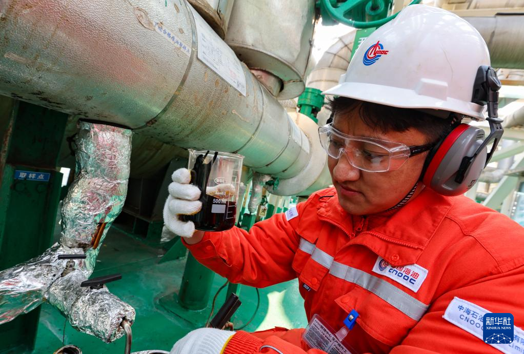 強(qiáng)巴在“渤海世紀(jì)號(hào)”(FPSO)上檢查原油油樣(3月7日攝)。 新華社記者 姜帆 攝