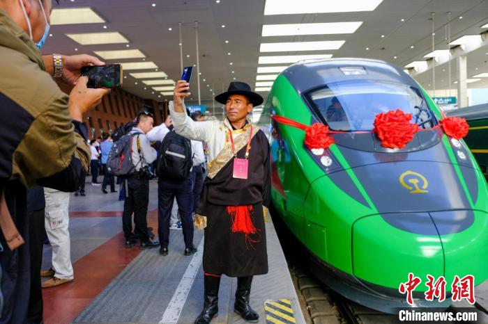 資料圖為2021年6月25日,西藏拉林鐵路開通運(yùn)營,拉薩曲水縣三有村村民次旦平措在復(fù)興號(hào)前拍照留念。江飛波 攝