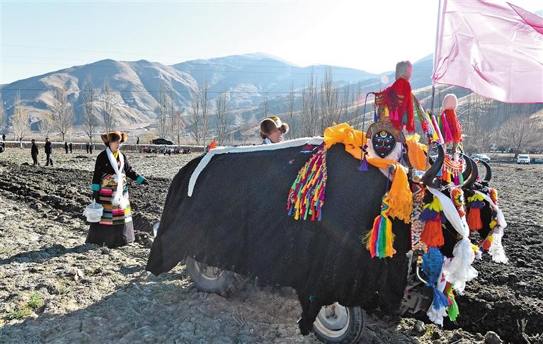 喝完青稞粥,多吉曲珍全家一起出動去社區(qū)高標準農(nóng)田參加春耕儀式。
