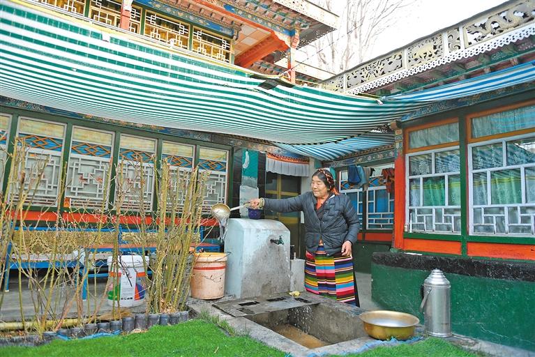 多吉曲珍在院子里接水澆花。 記者 旦增蘭澤 洛桑 唐斌 攝