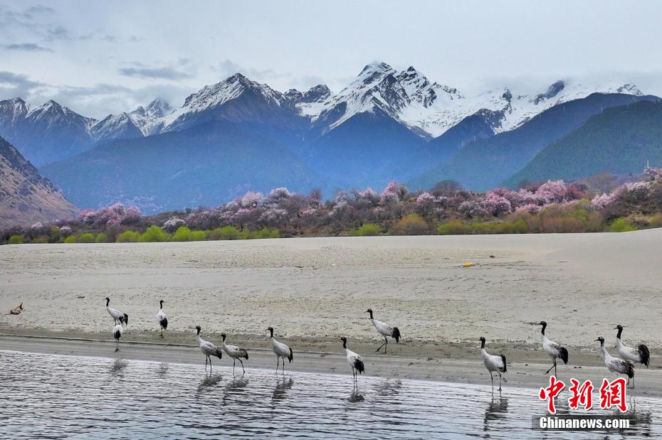 4月,在西藏林芝,遠(yuǎn)處的雪山、綻放的桃花和水邊休憩的黑頸鶴構(gòu)成一幅和諧美好的春日畫卷。圖為林芝市派鎮(zhèn)拍攝到的黑頸鶴。