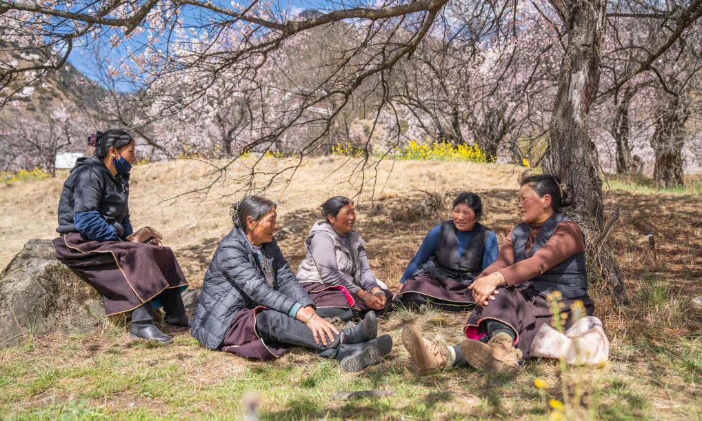午休時(shí),尼瑪曲吉(右二)與村民在桃樹(shù)下聊天(4月1日攝)。新華社記者 丁增尼達(dá) 攝