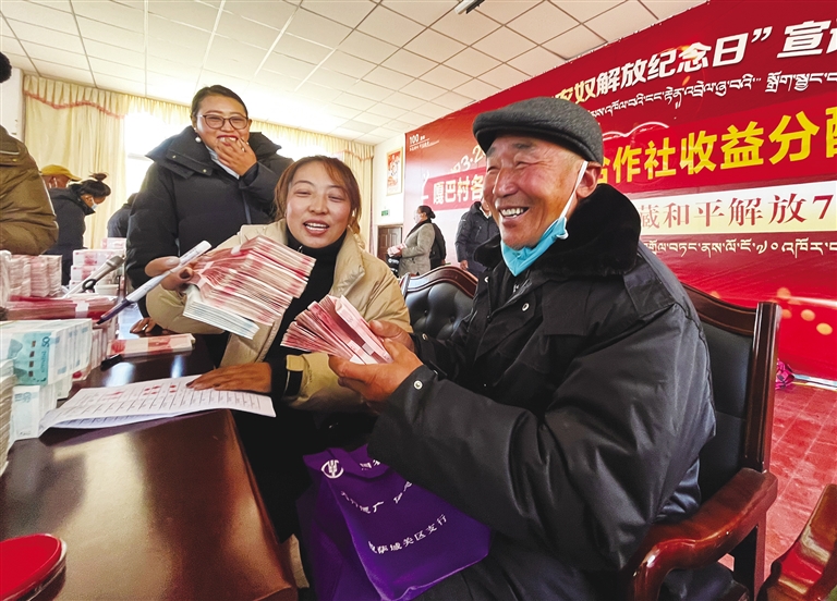 拉薩市城關(guān)區(qū)納金鄉(xiāng)嘎巴村分紅儀式現(xiàn)場?!∥鞑厝請笥浾摺〉┰鎏m澤 攝