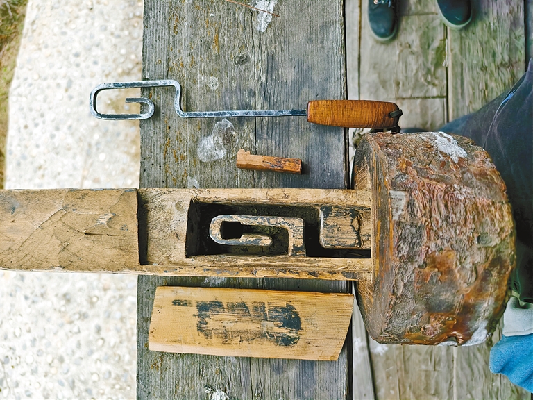 如此精致巧妙的木鎖怎么制作?我們又驅(qū)車來到了八蓋鄉(xiāng)巴瑞村,采訪了八蓋木鎖的第六代傳人次久羅布。他告訴我們,制作木鎖,首先要選一整塊的樺樹木,最好是結(jié)疤木,按照鎖的要求,用斧頭、鑿子將木頭削成圓形的鎖面和長方形的鎖芯,將鎖面和鎖芯之間掏空,留出鑰匙孔。在長方形的鎖芯中鑿出需要鑰匙進(jìn)入的形狀,直至孔道與鑰匙嚴(yán)絲合縫。再將青岡木制成的栓子放進(jìn)鎖芯前端被掏出的小孔中,并為鎖面覆上一層木板。這樣,一個木鎖便大致完成了。